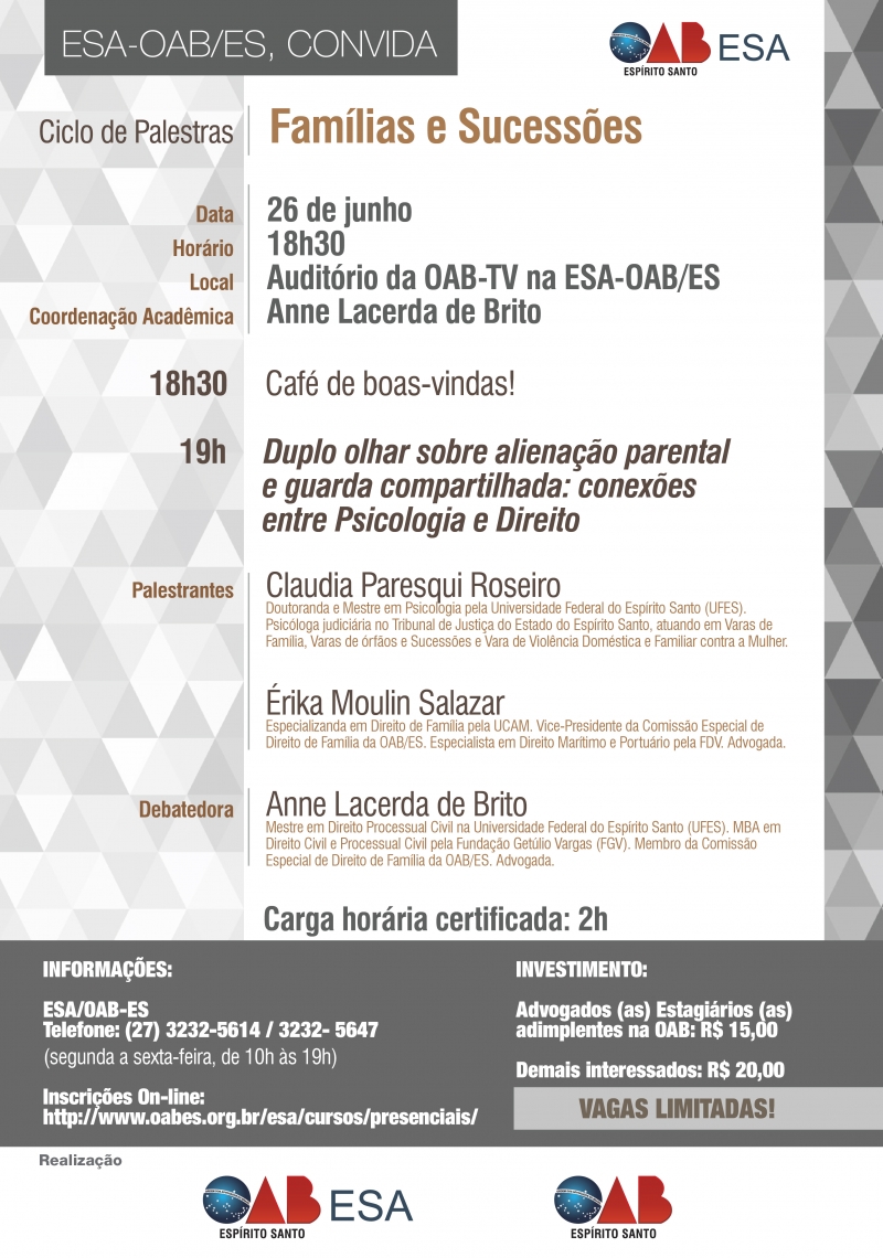 Inscrições online: http://www.oabes.org.br/esa/cursos/ciclo-de-palestras-familias-e-sucessoes-416.html