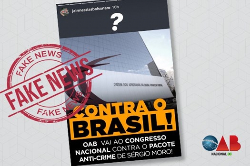 É mentirosa a informação divulgada nas redes sociais de que a OAB teria ido ao Congresso Nacional fazer campanha contra o pacote anticorrupção. A OAB é a favor do Brasil. Infelizmente, até o presidente Jair Bolsonaro compartilha em suas redes sociais notícias falsas. A Ordem dos Advogados do Brasil vai ao Congresso buscar aprimorar alguns pontos do pacote anticrime proposto pelo governo. Mais uma vez a Ordem é alvo das fakenews.