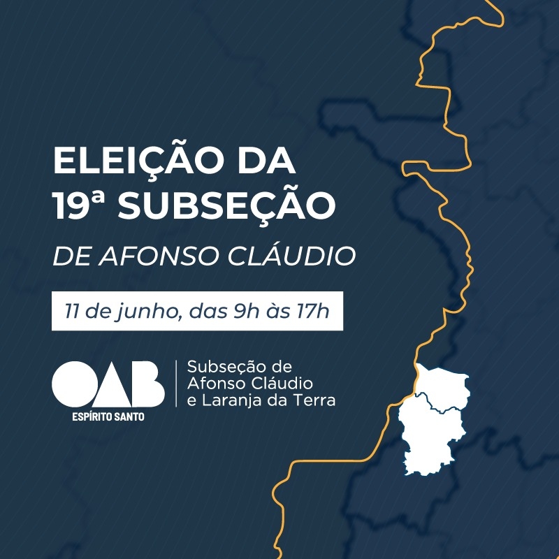 A OAB-ES chama a atenção da advocacia que abrange os municípios de Afonso Cláudio e Laranja da Terra, para as eleições nesta sexta-feira (11/06) da 19ª subseção de Afonso Cláudio, importante momento que envolve toda a categoria.