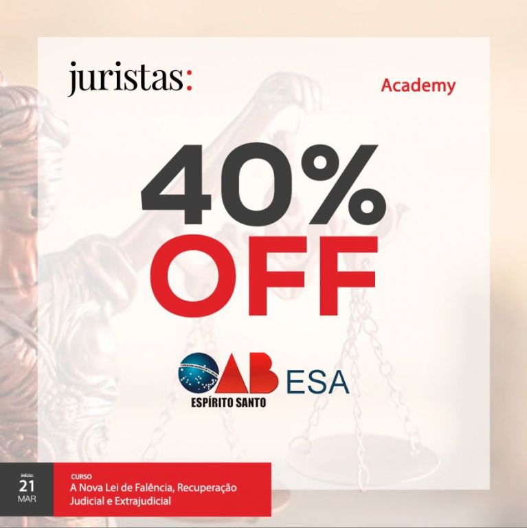 No próximo dia 21 de março, às 18 horas, a empresa Juristas, em parceria com a Escola Superior de Advocacia da Ordem dos Advogados do Brasil, Seccional Espírito Santo (OAB-ES), dará início ao curso on-line que versa sobre as recentes alterações na Lei de Recuperação de Empresas e Falência. A ESA-ES está oferecendo 40% de desconto para advogados e advogadas inscritos e adimplentes na Ordem.