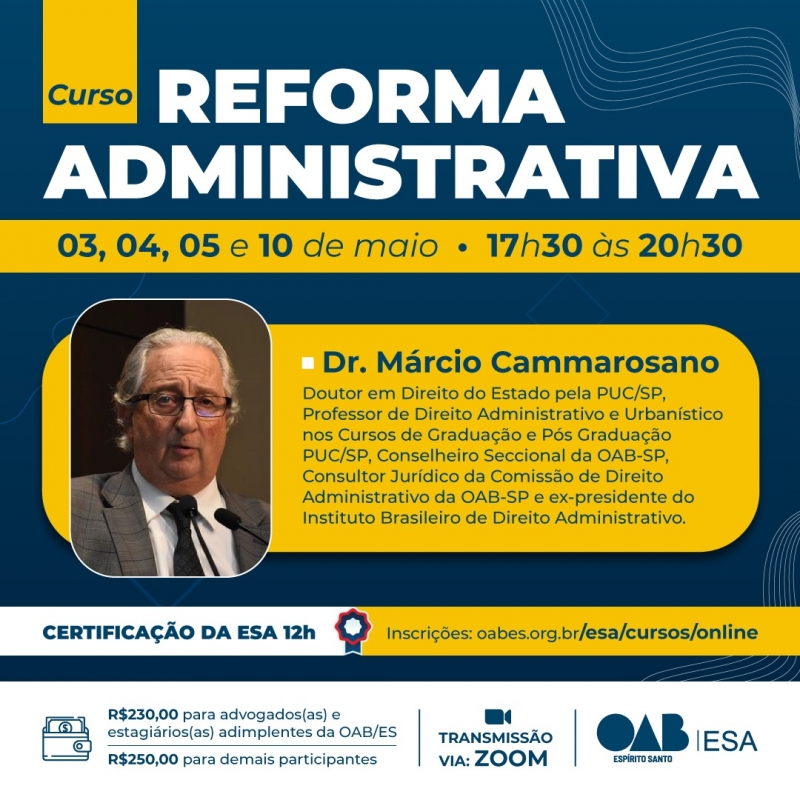 Estão abertas as inscrições para o curso Reforma Administrativa realizado pela ESA-ES. As aulas acontecerão nos dias 3, 4, 5 e 10 de maio, de 17h30 às 20h30, e serão ministradas pelo presidente do Instituto Brasileiro de Direito Administrativo, Márcio Cammarosano.
