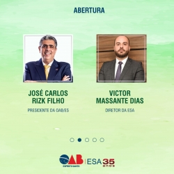 A Escola Superior de Advocacia (ESA-ES) vai realizar nesta quarta-feira (15/02) às 18h30, a aula magna para abrir oficialmente o calendário de atividades de 2023. A abertura será realizada pelo presidente da OAB-ES, José Carlos Rizk Filho, e o diretor da ESA-ES, Victor Massante Dias.