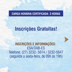 A Escola Superior da Advocacia (ESA / OAB-ES) realiza o “Debate sobre entrega voluntária” no dia 28 de julho, das 18h30 às 21h20, no auditório da ESA-ES. As inscrições são gratuitas e podem ser realizadas on-line (clique aqui) ou pelos telefones (27) 3232-5614 / 3232-5647, de segunda a sexta-feira, de 9h às 19h.