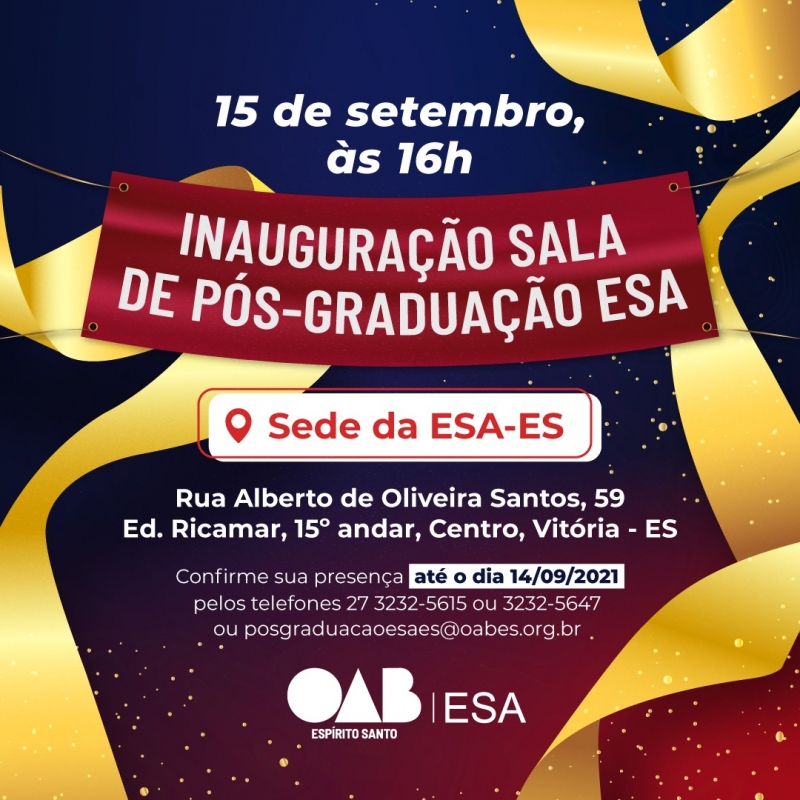 A Escola Superior de Advocacia do Espírito Santo (ESA-ES) vai contar com uma sala de atendimento dos seus cursos próprios de pós-graduação. A inauguração acontece nesta quarta-feira (15/09), às 16 horas.