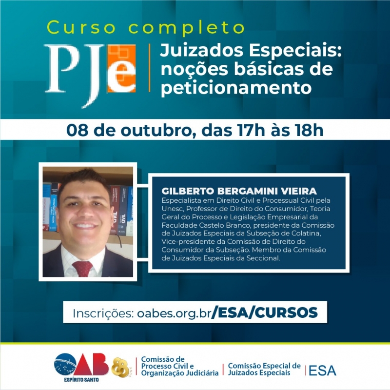 A ESA-ES vai oferecer à advocacia o curso completo de PJE - Juizados Especiais: Noções Básicas de Peticionamento na próxima quinta-feira (8/10).