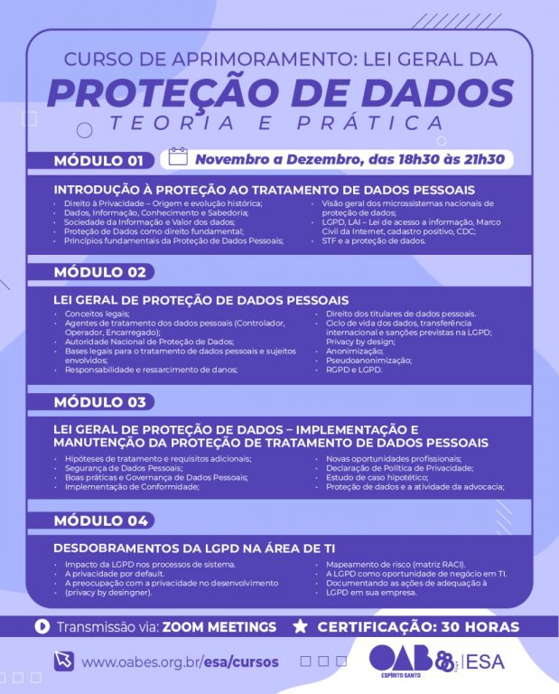 A ESA-ES promove o curso on-line de aprimoramento teórico e prático sobre a Lei Geral de Proteção de Dados nos meses de novembro e dezembro.