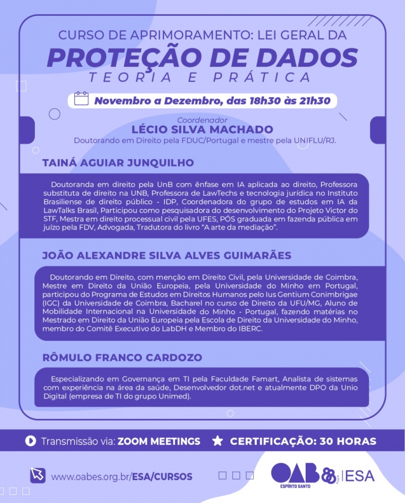 A coordenação pedagógica do curso é do professor doutor Lécio Silva Machado. Atualmente, ele é membro da Associação Nacional dos Profissionais de Proteção de Dados (ANPPD) e faz consultoria e assessoria jurídica para a conformidade com a LGPD em várias empresas no estado do Espírito Santo.