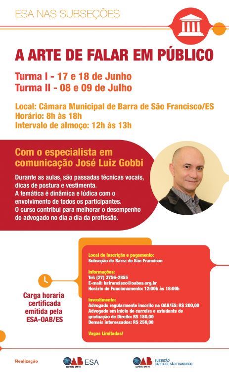 Além disso, a Escola de Advocacia também prioriza a interiorização dos cursos com o projeto ESA nas Subseções. E no próximo dia 17 será realizada a palestra da 5ª Subseção de Barra de São Francisco em parceria com a ESA o curso com o tema “A Arte de Falar em Público” voltado para o melhor desempenho do advogado na profissão. A aula será ministrada pelo especialista em comunicação José Luiz Gobbi, que trabalha de forma dinâmica, com brincadeiras, técnicas vocais, dicas de postura e até como se vestir.