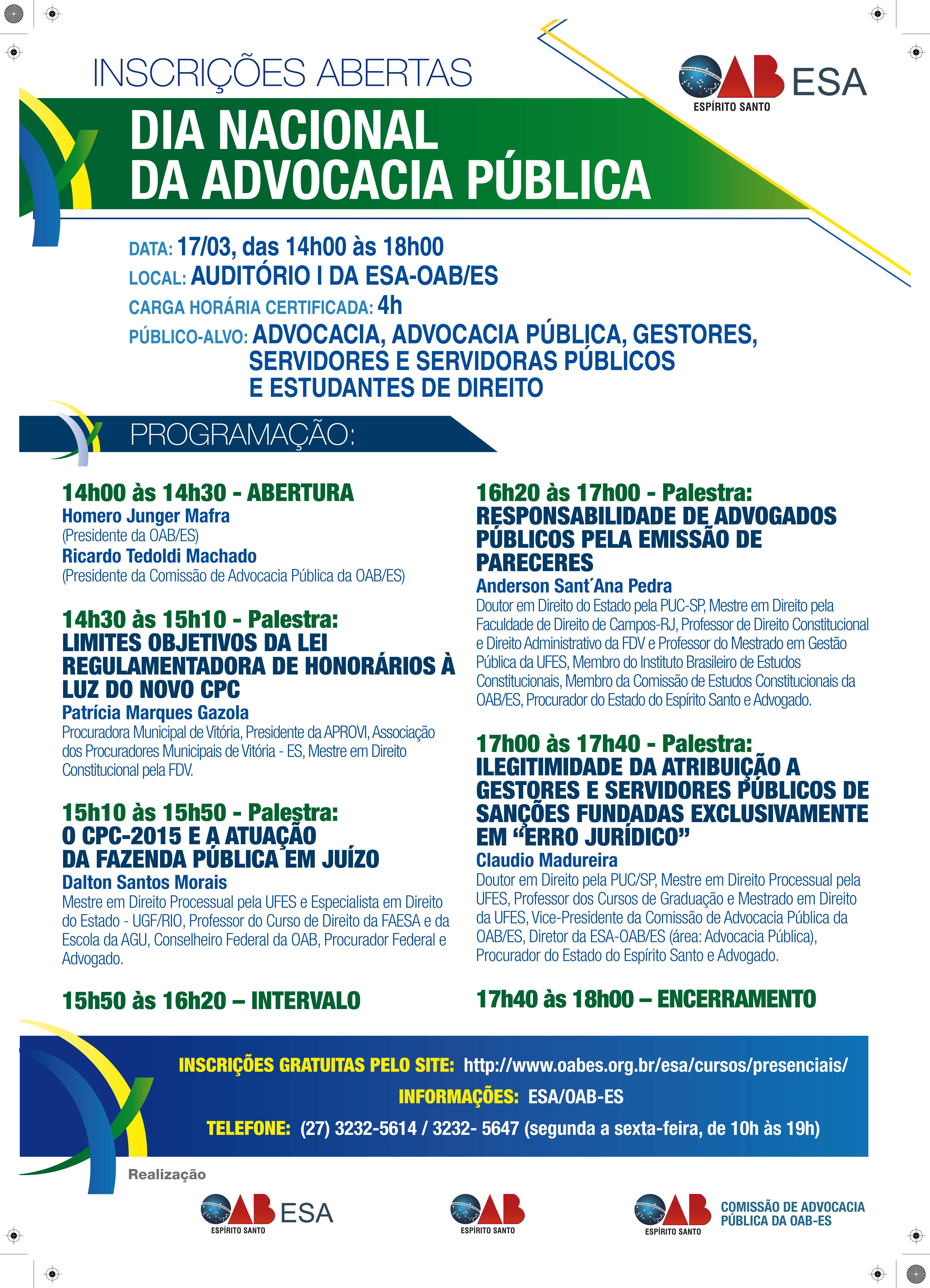 A Ordem dos Advogados do Brasil – Seção Espírito Santo (OAB-ES), por meio da Escola Superior de Advocacia (ESA), convida para o ciclo de palestras intitulado “Dia Nacional da Advocacia Pública”, a ser realizado na próxima sexta (17), no auditório da ESA.