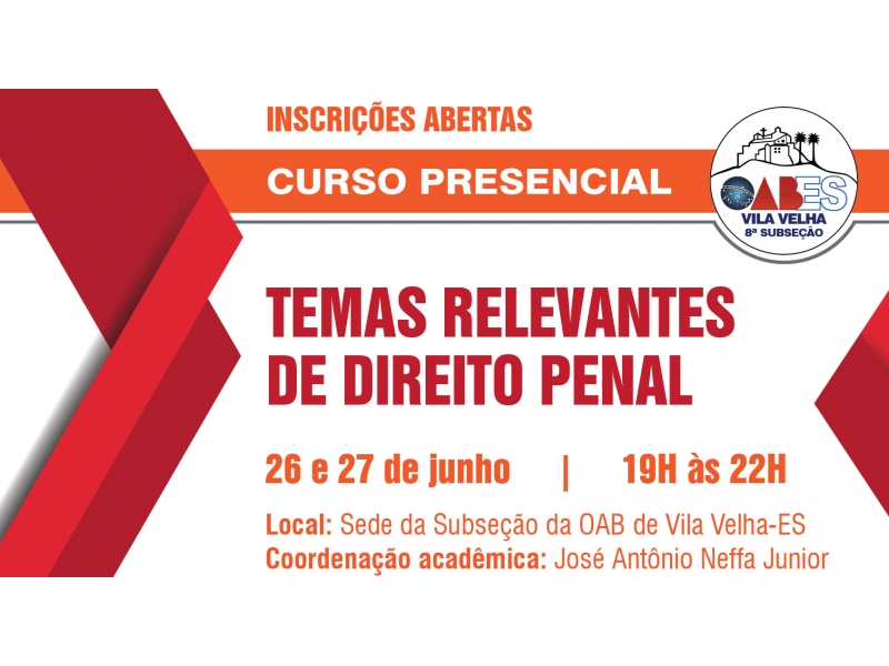 A Escola Superior de Advocacia da Ordem dos Advogados do Brasil - Seção Espírito Santo (ESA/OAB-ES), convida para o curso "Temas relevantes do Direito Penal", que acontece nos dias 26 e 27 de junho, de 19 às 22 horas, na Subseção de Vila Velha da OAB-ES.