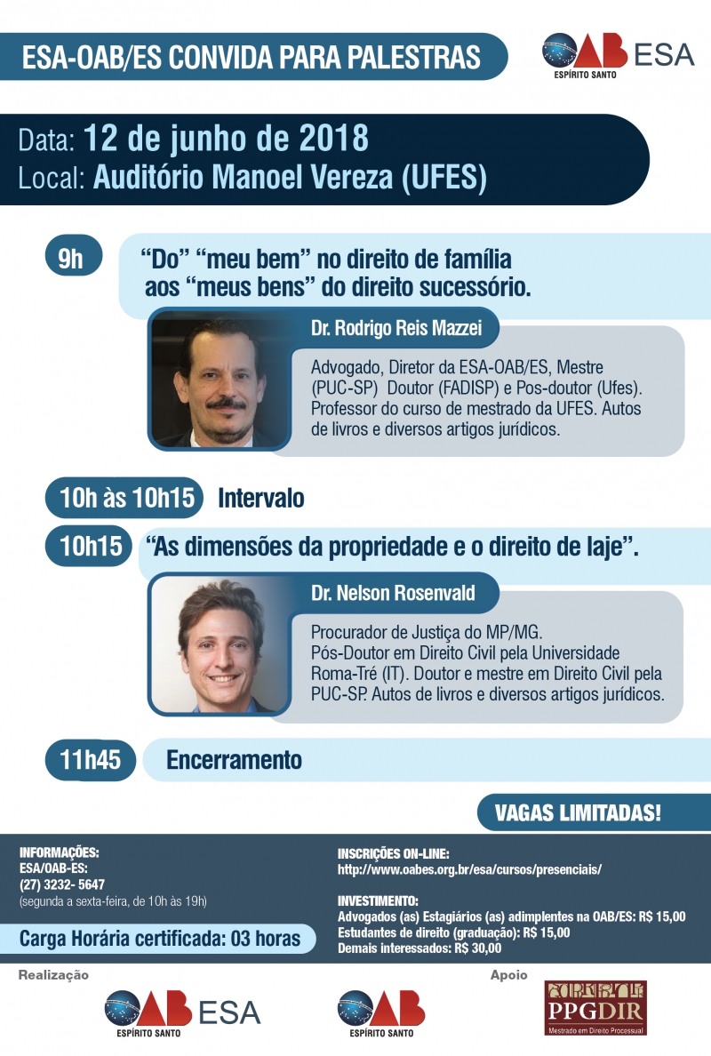 No dia 12 de junho, a Escola Superior de Advocacia (ESA) da Ordem dos Advogados do Brasil - Seção Espírito Santo (OAB-ES) convida para duas palestras inusitadas sobre questões patrimoniais de forma objetiva e inovadora, no auditório Manoel Vereza, na UFES.