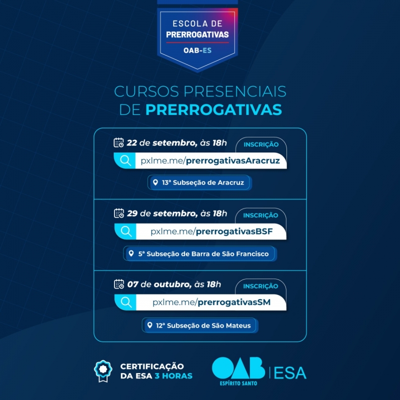 Já no dia 7 de outubro (quinta-feira), às 18 horas, será a vez da advocacia da 12ª Subseção de São Mateus participar do curso de prerrogativas.