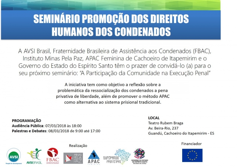 Na próxima quarta-feira (7), o Teatro Rubem Braga, em Cachoeiro de Itapemirim, será palco do Seminário Promoção dos Direitos Humanos dos Condenados, promovido pela AVSI Brasil, Fraternidade Brasileira de Assistência aos Condenados (FBAC), Instituto Minas Pela Paz, APAC Feminina de Cachoeiro de Itapemirim e pelo Governo do Estado do Espírito Santo.