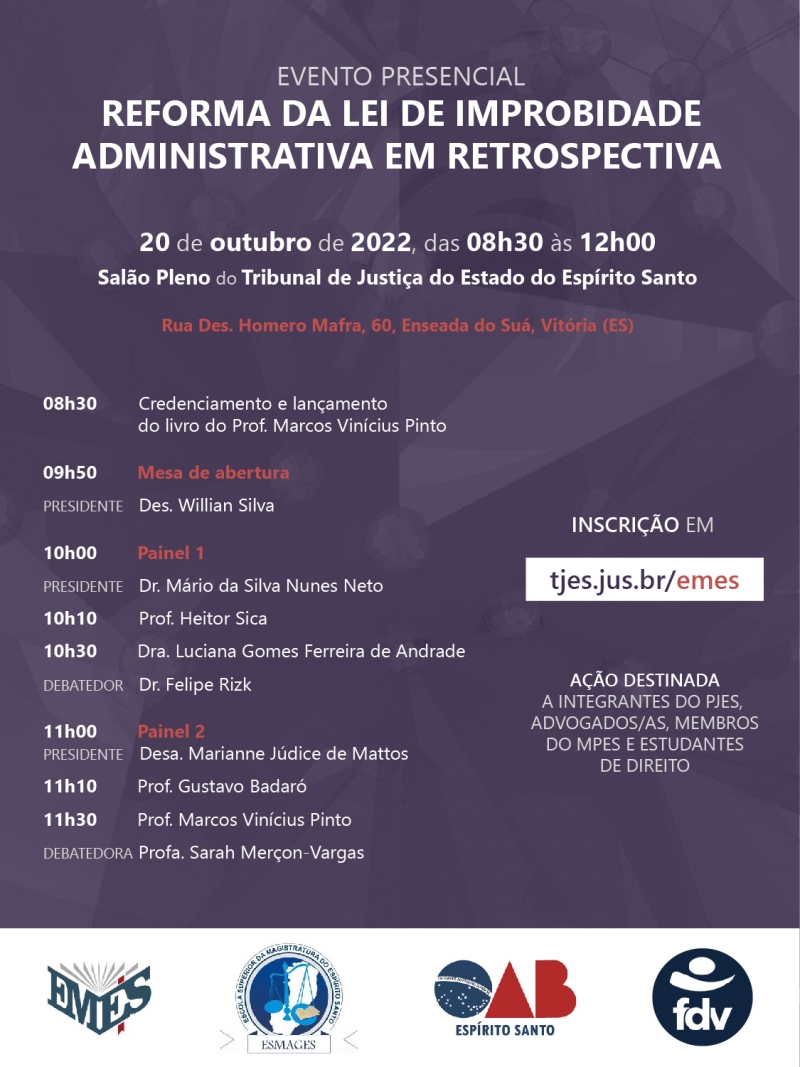 Com apoio da Comissão de Direito Administrativo Sancionador da Ordem dos Advogados do Brasil - Seccional Espírito Santo (OAB-ES), a Escola da Magistratura do Estado do Espírito Santo (Emes), a Escola Superior da Magistratura do Estado do Espírito Santo (Esmages) e a Faculdade de Direito de Vitória (FDV), promovem o evento Reforma da Lei de Improbidade Administrativa em Retrospectiva no dia 20 de outubro, a partir das 8h30, no Salão Pleno do TJES.