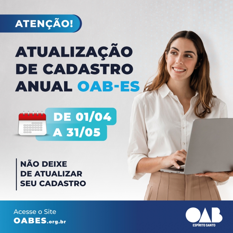A Ordem dos Advogados do Brasil, Seccional Espírito Santo (OAB-ES), dá início, a partir desta sexta-feira, 1º de abril, à Campanha de Recadastramento Anual, em cumprimento às diretrizes e normativas legais, regulamentadas pelo Conselho Federal e no Regimento Interno da Seccional. O prazo para cadastramento vai até 31 de maio de 2022.