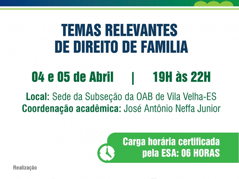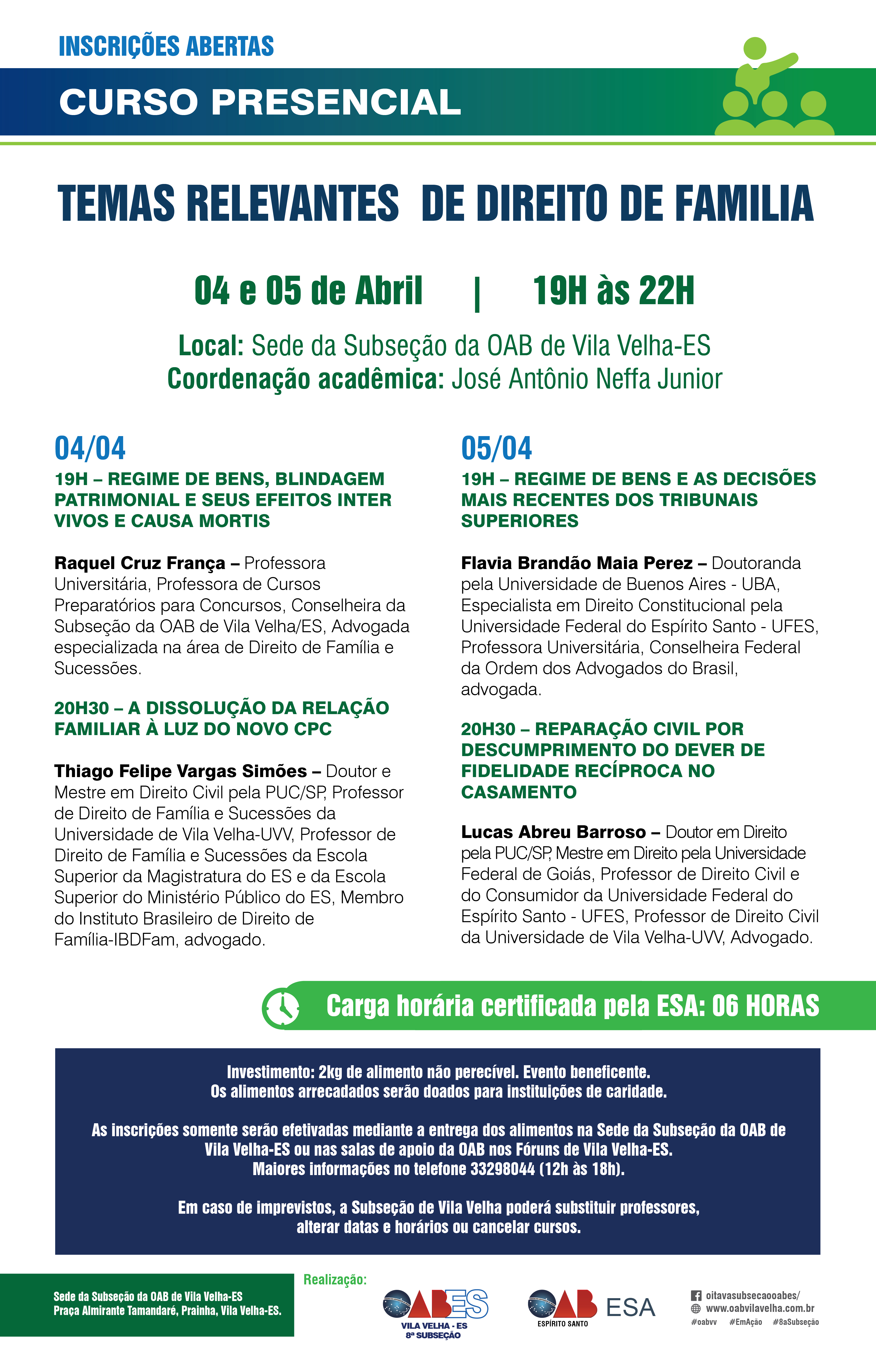 Os advogados de Vila Velha poderão adquirir mais conhecimento sobre direito de família durante o curso que será realizada na sede da 8ª Subseção da OAB-ES, nos dias 04 e 05 de abril, de 19h às 22h. Com a coordenação acadêmica do advogado José Antônio Neffa Junior, o curso vai abordar temas como regime de bens, blindagem patrimonial, dissolução da relação familiar à luz do novo CPC e muitos outros assuntos.
