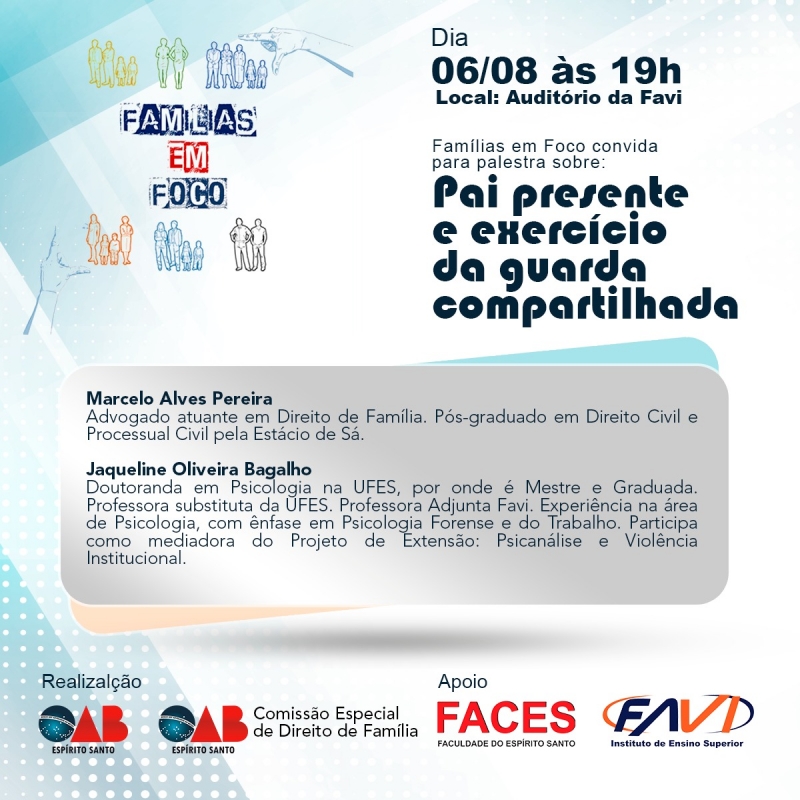 A Comissão Especial de Direito de Família da Ordem dos Advogados do Brasil, Seção Espírito Santo (OAB-ES) realiza no dia 06/08 (segunda-feira), através do programa “Famílias em Foco”, a palestra “Pai Presente e Exercício da Guarda Compartilhada”, que acontece no auditório da FAVI- Instituto de Ensino Superior, às 19h.