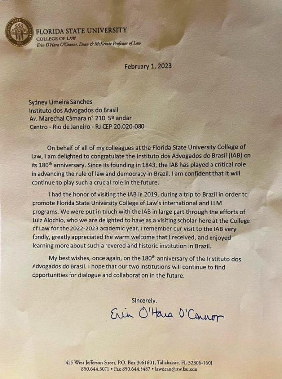 Por intermédio do advogado capixaba e consócio Luiz Alochio, o presidente nacional do Instituto dos Advogados Brasileiros (IAB), Sydney Sanches, recebeu uma carta de congratulações pelos 180 anos de fundação da entidade, assinada pela professora Erin O’Hara O’Connor, em nome de todos os docentes da Faculdade de Direito da Florida State University (EUA).