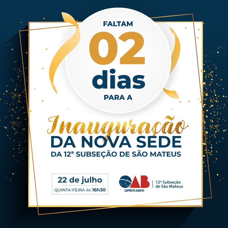 A 12ª Subseção de São Mateus da OAB-ES vai ganhar uma nova sede. A inauguração está marcada para quinta-feira (22/07), às 16h30 horas. A solenidade contará com a presença do presidente da OAB-ES, José Carlos Rizk Filho e do presidente da 12ª Subseção de São Mateus, Patrick de Oliveira Malverdi.