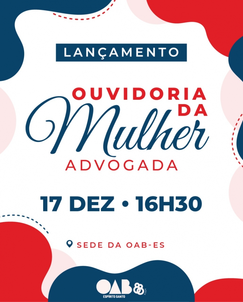A inauguração oficial da Ouvidoria da Mulher Advogada da OAB-ES será quinta-feira (17/12) com presença confirmada da vice-governadora do Estado, Jacqueline Moraes, e da subsecretária de Estado de Políticas para Mulheres, Juliana de Araújo Barroso.