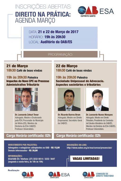 As palestras serão ministradas pelos advogados, Leonardo Zehuri Tovar, que é membro da diretoria da ESA e procurador do município de Vitória, Ricardo Brum, que é secretário-geral da OAB-ES e mestre em direito empresarial e Leonardo Nunes Marques, que também é presidente da Comissão de Estudos Tributários da Ordem e mestre em direito tributário.