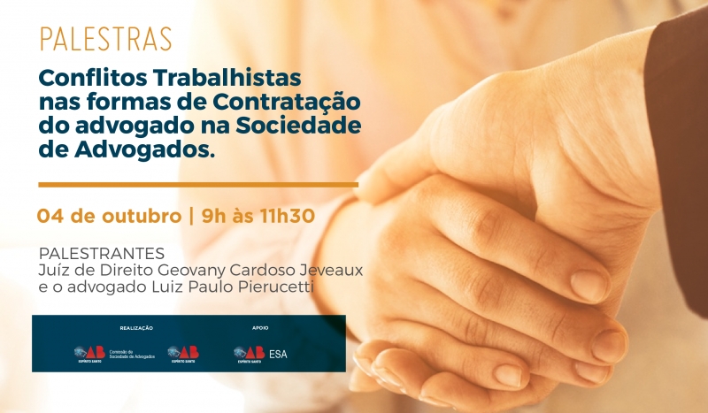 Inscrições encerradas para palestras sobre os tipos de relações do advogado contratado na sociedade de advogado na visão da Justiça do Trabalho que estarão em debate nesta quarta-feira, dia 04, na OAB-ES. O assunto será debatido pelo Juiz de Direito Geovany Cardoso Jeveaux e pelo advogado Luiz Paulo Pieruccetti, a partir das 9h.