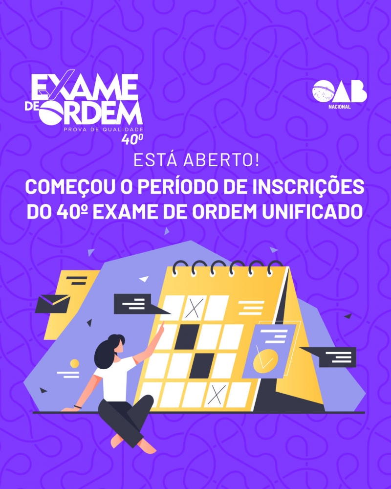 Estão abertas as inscrições, entre esta segunda-feira (8/1) e 16 de janeiro, para o 40º Exame de Ordem Unificado (EOU). Clique aqui para conhecer o edital do exame.