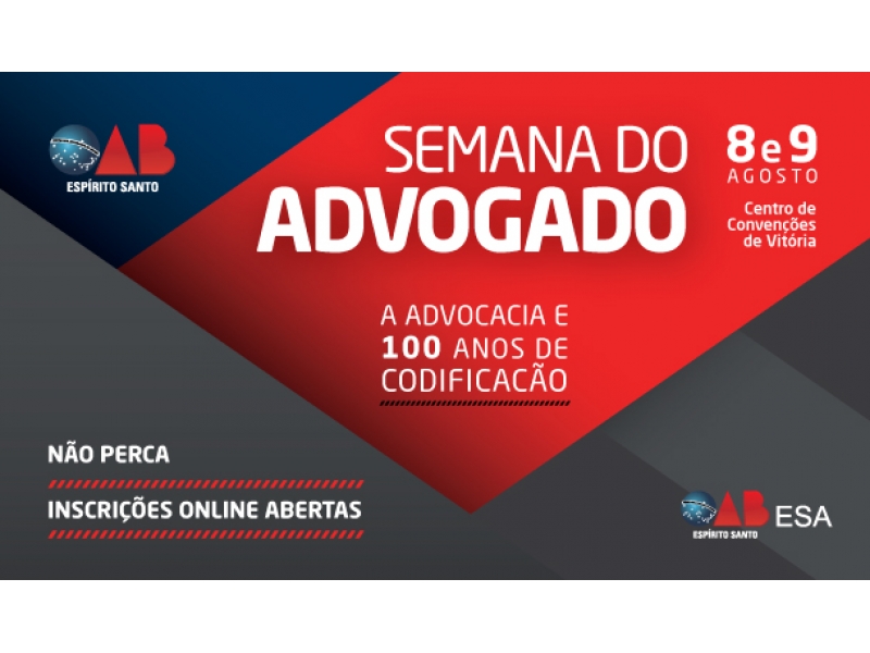 Os advogados em início de carreira têm direito a um desconto promocional. O evento organizado pela Escola Superior de Advocacia da Ordem dos Advogados do Brasil – Seção Espírito Santo (ESA/OAB-ES) reunirá em Vitória profissionais renomados na área jurídica. Esta semana serão divulgados os temas das palestras. O evento é beneficente.