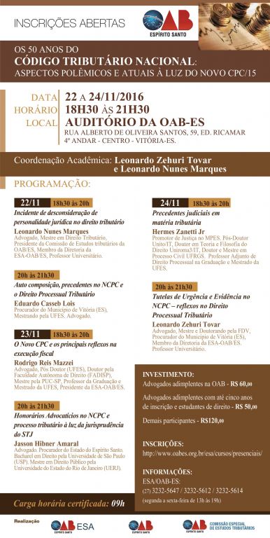 A Escola Superior de Advocacia da Ordem dos Advogados do Brasil – Seção Espírito Santo (ESA/OAB-ES) e a Comissão de Estudos Tributários convidam para o curso “Os 50 anos do Código Tributário Nacional: Aspectos Polêmicos e atuais à luz do Novo CPC/15”, realizado entre os dias 22 e 24 deste mês, no auditório da OAB-ES, de 18h30 às 21h30.