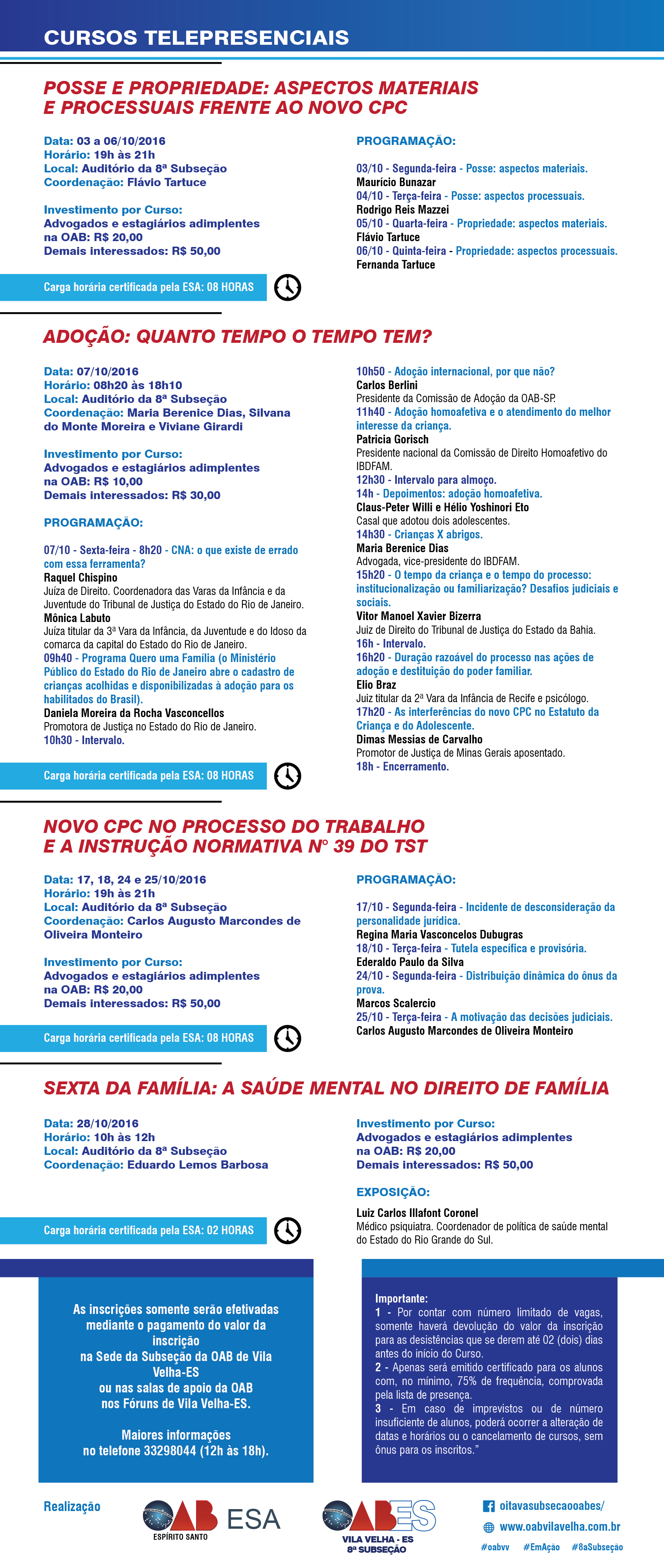 Os cursos vão acontecer entre os dias 03 e 28 de outubro de acordo com a programação estabelecida. As inscrições devem ser feitas na sede da Subseção de Vila Velha ou nas salas de apoio da OAB nos fóruns da cidade. Mais informações pelo telefone 3329-8044.