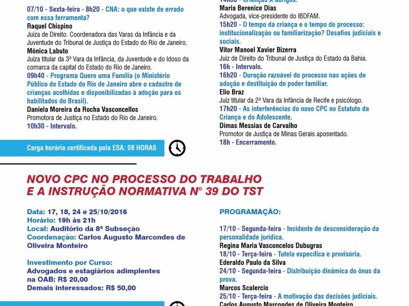 Durante as aulas serão debatidos temas como “posse e propriedade”, “adoção”, “novo CPC no processo do trabalho” e a “saúde mental no direito de família”.