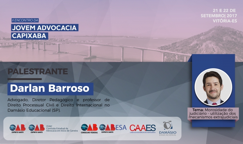 O advogado e professor de São Paulo estará no II Encontro da Jovem Advocacia Capixaba, nos próximos dias 21 e 22, falando sobre "A Morosidade do Judiciário - Utilização dos Mecanismos Extrajudiciais". Os interessados em participar desse grande Encontro que marcará o ano de 2017 devem se apressar para efetivar a inscrição, pois as vagas são limitadas.