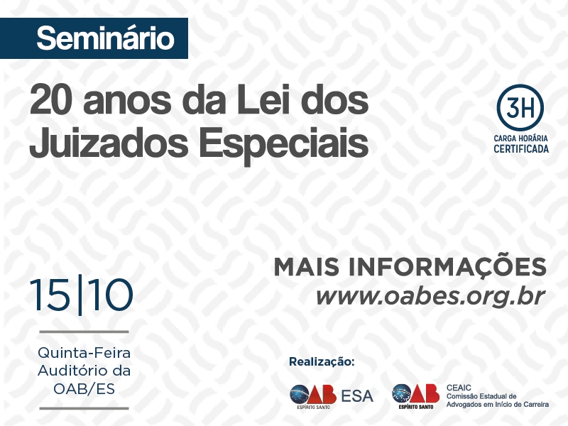 Em comemoração aos 20 anos da lei Lei n. 9.099/1995 dos juizados especiais cíveis e criminais será realizado um seminário gratuito na próxima quinta-feira (15), de 18h30 às 21h, fazendo uma análise da lei 9.099/95 e sua aplicabilidade nesses anos e dos efeitos desta lei na Advocacia. A realização é da OAB-ES, por meio da Comissão Estadual de Advogados em Início de Carreira (CEAIC) e da Escola Superior de Advocacia.