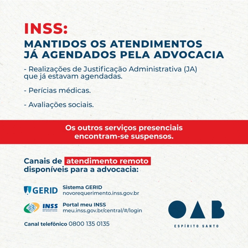 Dentre os serviços estão: realizações de Justificação Administrativa (JA) que já estavam agendados, perícias médicas e avaliações sociais. Os outros serviços presenciais encontram-se suspensos.