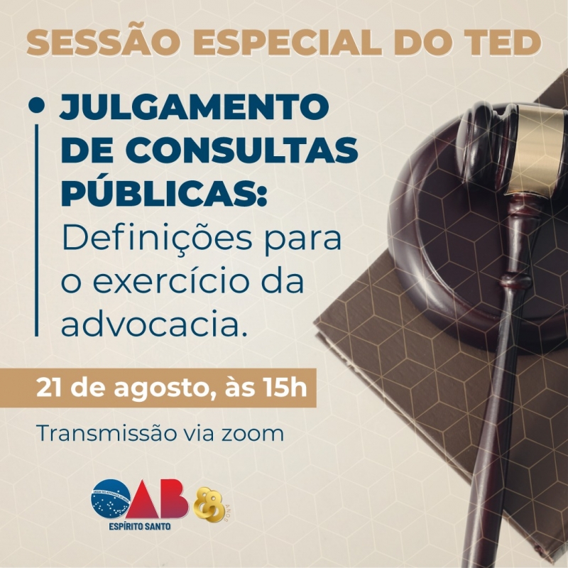 A sessão do Tribunal de Ética e Disciplina (TED) da OAB-ES fará, nesta sexta-feira (21), uma sessão inédita. O julgamento das consultas realizadas pelos advogados para definições do exercício da advocacia será aberto a toda a sociedade.
