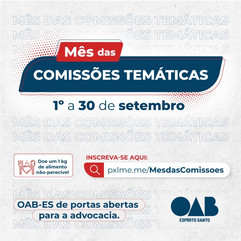 Está chegando a hora e as inscrições estão abertas. Começa nesta quarta-feira (1º/09), o Mês das Comissões Temáticas da OAB-ES. O evento, inédito, terá como tema “OAB-ES de portas abertas para a advocacia”. Durante todo o mês, haverá programação com especialistas nacionais e capixabas, abordando diferentes aspectos do Direito. Serão 48 palestras, 21 presenciais e 27 virtuais.