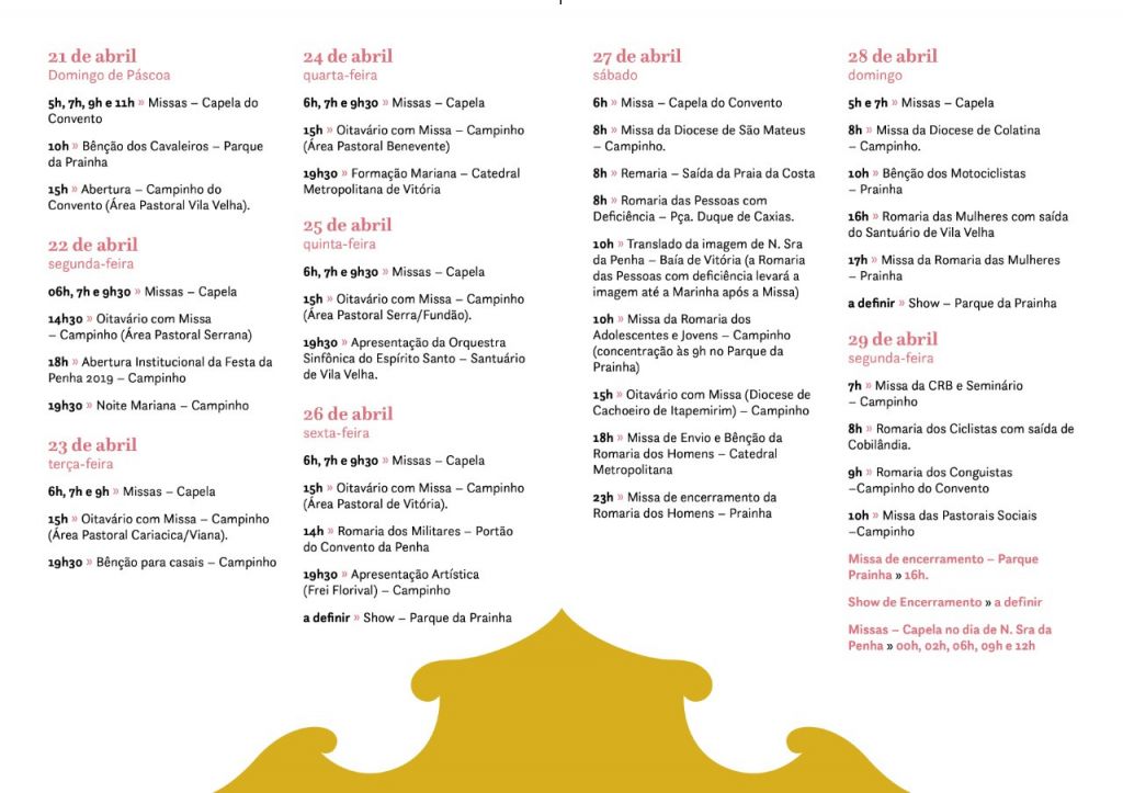 Este ano, o tema da festa será “Eis aqui a serva do Senhor” - Lucas 1, 38, que, segundo Frei Pedro de Oliveira, é também a primeira das 7 Alegrias de Nossa Senhora, “quando ela recebe o anúncio do anjo dizendo que ela seria a mãe de Jesus e ela espontaneamente diz ‘eis aqui a serva’. Então, para nós franciscanos cuidando deste Santuário, como eu sempre digo: ‘os franciscanos são os guardiães da Padroeira do Espírito Santo’”, afirmou o franciscano no site oficial do Convento da Penha.