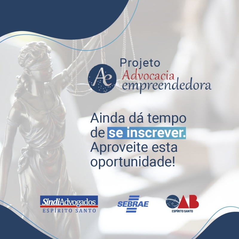 Ainda dá tempo dos advogados e advogadas capixabas participarem do projeto “Advocacia Empreendedora", uma parceria pioneira entre o Sebrae-ES, a OAB-ES e o Sindiadvogados-ES, que busca incentivar profissionais autônomos e escritórios para a necessidade de uma boa gestão dos negócios.