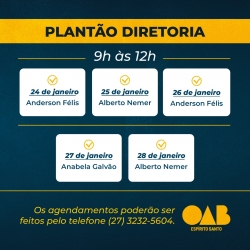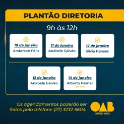 Os atendimentos serão prestados pela vice-presidente da OAB-ES, Anabela Galvão; pelo secretário-geral, Alberto Nemer Neto; pelo tesoureiro Anderson Ferreira Félis e pela secretária-geral adjunta, Silvia Maria Lameira Hansen.