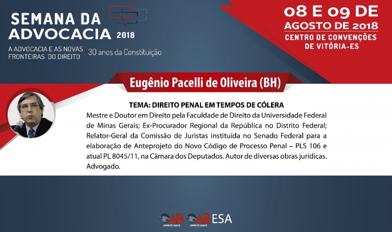 18h40 - Conferência de Encerramento: Direito Penal em Tempos de Cólera - Eugênio Pacelli de Oliveira (BH) - Mestre e Doutor em Direito pela Faculdade de Direito da Universidade Federal de Minas Gerais; Ex-Procurador do Estado de Minas Gerais; Ex-Procurador Regional da República no Distrito Federal; Relator-Geral da Comissão de Juristas instituída no Senado Federal para a elaboração de Anteprojeto do Novo Código de Processo Penal – PLS 106 e atual PL 8045/11, na Câmara dos Deputados. Autor de diversas obras jurídicas. Advogado.