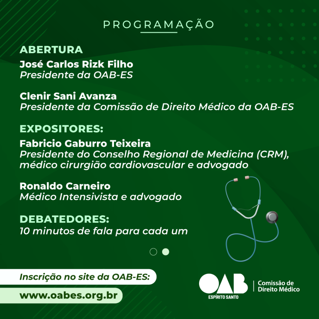 A Ordem dos Advogados do Brasil, Seccional Espírito Santo (OAB-ES), através da Comissão de Direito Médico e sua presidente Clenir Sani Avanza, já abriu as inscrições para a Audiência Pública “Políticas Públicas de Saúde, Prestação de Serviços Médicos da Saúde - Condições de Trabalho, Vínculos e Contratualizações”, que será realizada em 26 de maio, às 14 horas, no Auditório da Ordem. O evento será híbrido, presencial e pelo Zoom.