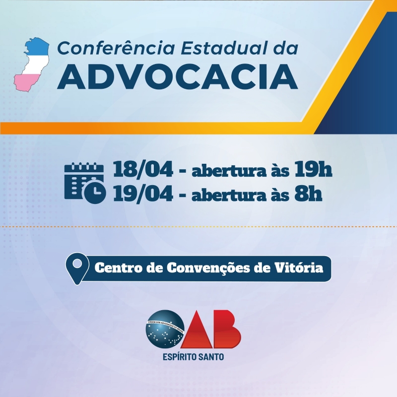 A Ordem dos Advogados do Brasil (OAB-ES) abre nesta segunda-feira (19/02) inscrições para participação na Conferência Estadual da Advocacia nos dias 18 e 19 de abril, no Centro de Convenções de Vitória. O evento terá como tema principal "A Nova Advocacia".