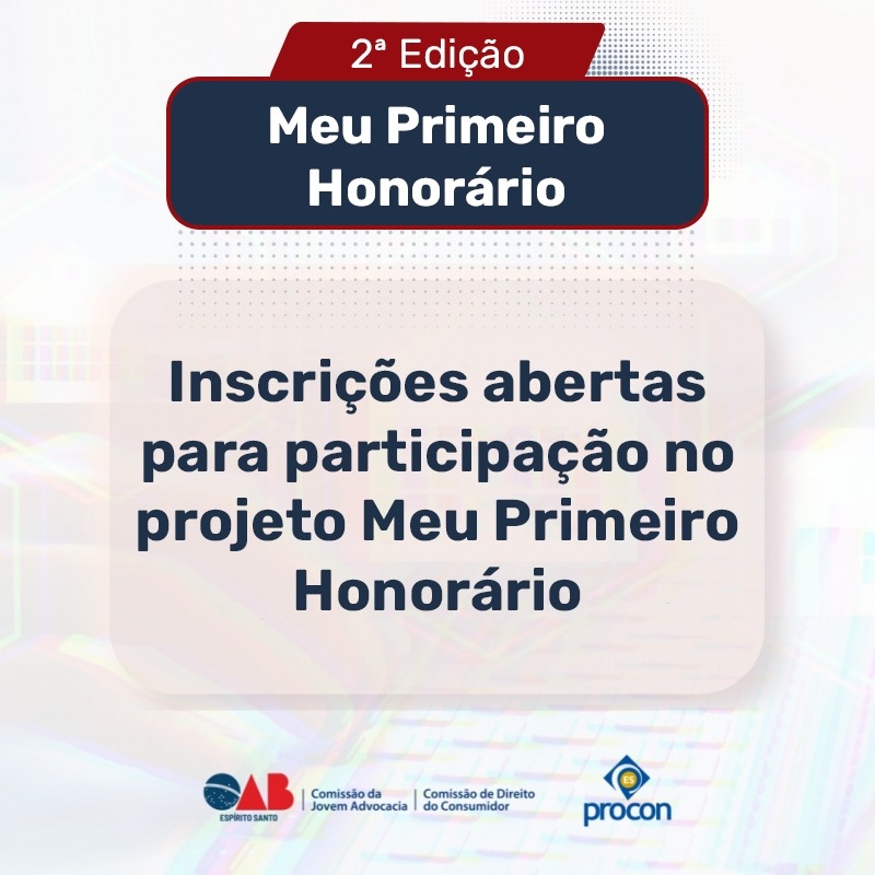 A Ordem dos Advogados do Brasil - Seccional Espírito Santo (OAB-ES) abre inscrições para participação de jovens advogados e advogadas na segunda edição do Projeto Meu Primeiro Honorário, uma iniciativa da Comissão da Jovem Advocacia e de Direito do Consumidor, em parceria com o Instituto Estadual de Proteção e Defesa do Consumidor (Procon-ES).