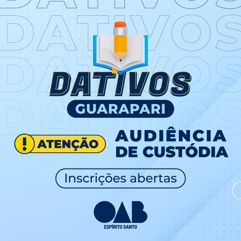 A Ordem dos Advogados do Brasil – Seccional Espírito Santo (OAB-ES) abre nesta segunda-feira (04/04), a partir das 10 horas, as inscrições para o cadastro de advogados e advogadas dativos na comarca de Guarapari - Audiência de Custódia.