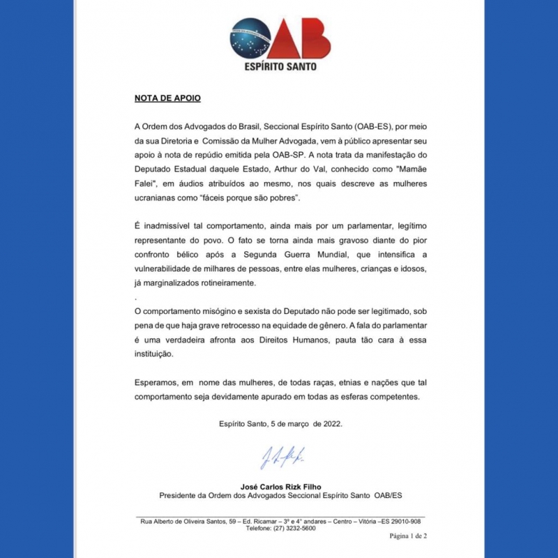 Neste sábado (05/03), a Ordem dos Advogados do Brasil, Seccional Espírito Santo (OAB-ES), por meio de sua Diretoria e Comissão da Mulher Advogada, vem a público apresentar seu apoio à nota de repúdio emitida pela OAB-SP, que trata da manifestação do Deputado Estadual daquele Estado, Arthur Val, conhecido como "Mamãe Falei", em áudios atribuídos ao mesmo, nos quais descreve as mulheres ucranianas como "fáceis porque são pobres".