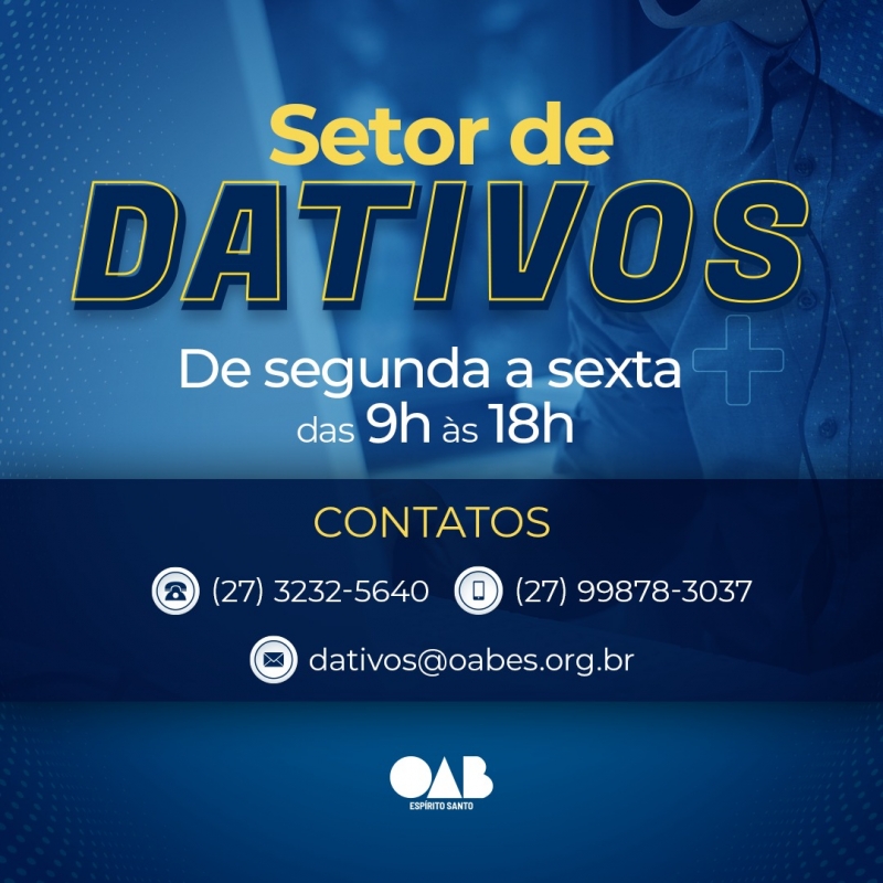 O novo setor de Dativos funcionará na sede da Seccional, no Centro, em Vitória e atenderá das 9h às 18 horas. Os contatos também poderão ser feitos por meio dos telefones (27) 3232-5640, (27) 99878-3037, do e-mail: dativos@oabes.org.br e pelo Sistema Eletrônico da OAB-ES (Dataged), que também servirá como canal de denúncias.