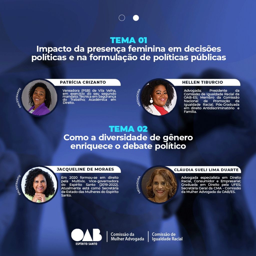 E sobre o tema “Como a diversidade de gênero enriquece o debate político” contará com a participação da Secretária Estadual das Mulheres, Jacqueline Moraes, e da secretária-geral da Comissão da Mulher Advogada da OAB-ES, Cláudia Sueli Lima Duarte.