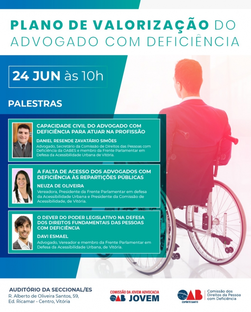 A OAB Jovem Social e Comissão dos Direitos da Pessoa com Deficiência convidam para um debate onde serão discutidas questões referentes ao Plano de Valorização do Advogado com Deficiência, onde se suscita a necessidade de uma atuação para fins de inclusão da advogada e do advogado com deficiência. Esperamos vocês, no dia 24 de junho, às 10 horas, no auditório da seccional da OAB/ES. OAB de todos, OAB para todos.
