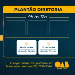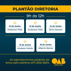 A OAB-ES acaba de divulgar os horários do plantão da sua Diretoria para atendimento exclusivo para a advocacia capixaba neste mês de junho.