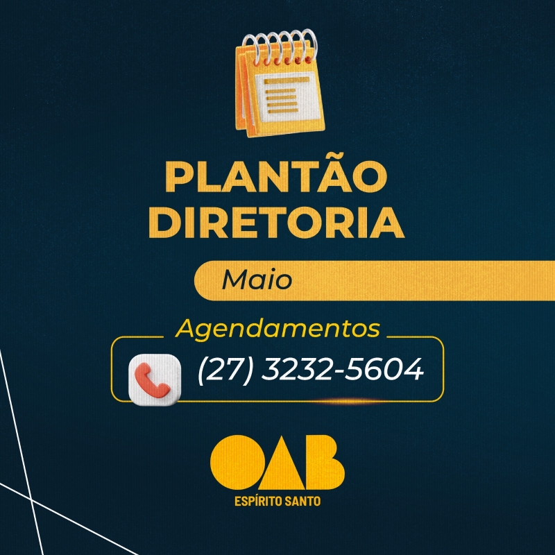 A OAB-ES acaba de divulgar os horários do plantão da sua Diretoria para atendimento exclusivo para a advocacia capixaba neste mês de maio.